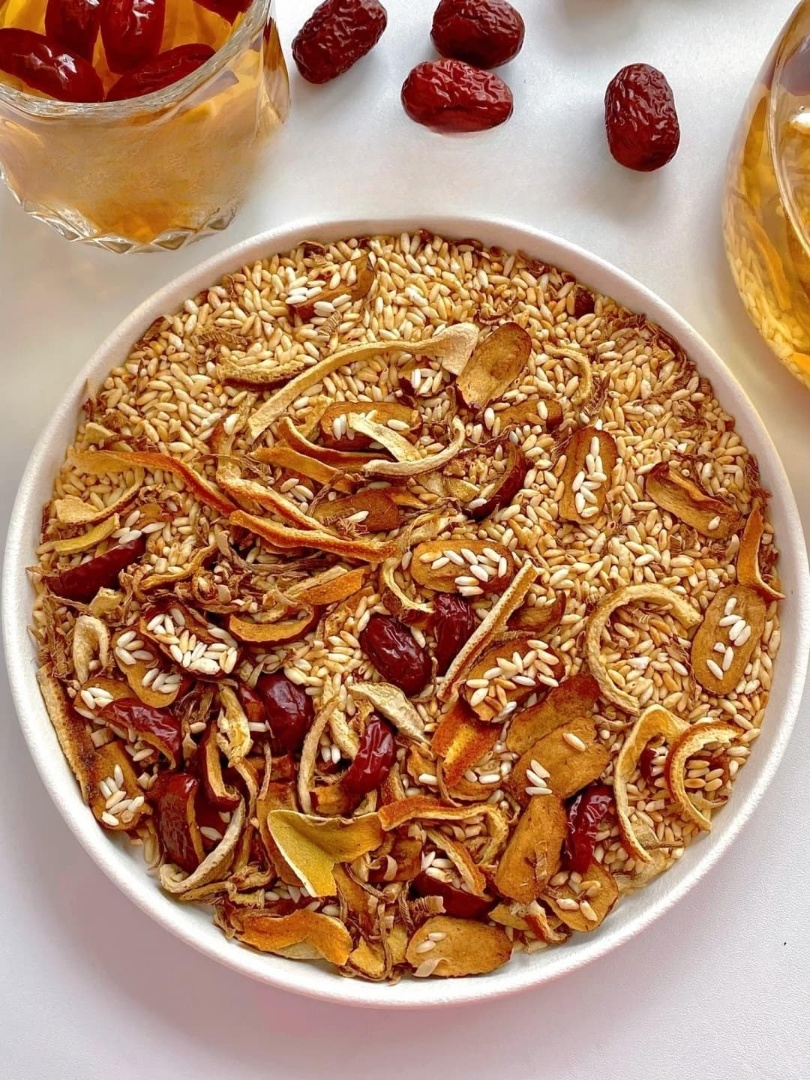 - The De-puffing Water: Stir-fried rice tea with dried tangerine peel. It acts as a natural diuretic to help with morning puffiness.